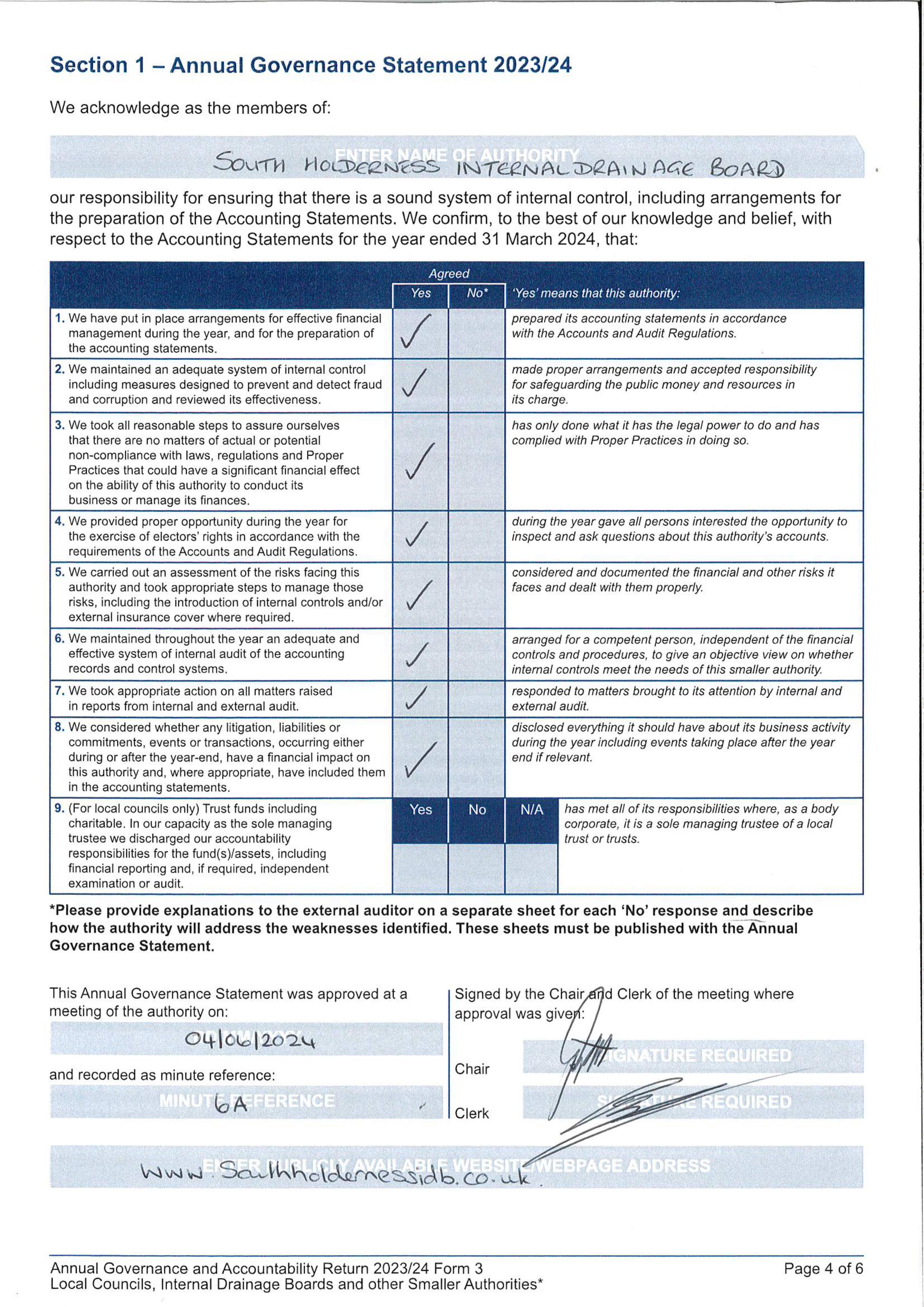 1. Date of announcement_________5 June 2024______________________________(a) 2. Each year the smaller authority’s Annual Governance and Accountability Return (AGAR) needs to be reviewed by an external auditor appointed by Smaller Authorities’ Audit Appointments Ltd. The unaudited AGAR has been published with this notice. As it has yet to be reviewed by the appointed auditor, it is subject to change as a result of that review. Any person interested has the right to inspect and make copies of the accounting records for the financial year to which the audit relates and all books, deeds, contracts, bills, vouchers, receipts and other documents relating to those records must be made available for inspection by any person interested. For the year ended 31 March 2024, these documents will be available on reasonable notice by application to: